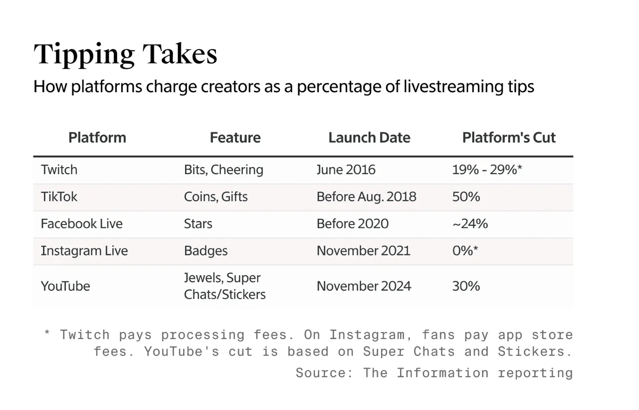 Como mostra o gráfico do The Information, a maioria dos principais aplicativos sociais agora oferece este formato de incentivo para streamers ao vivo.