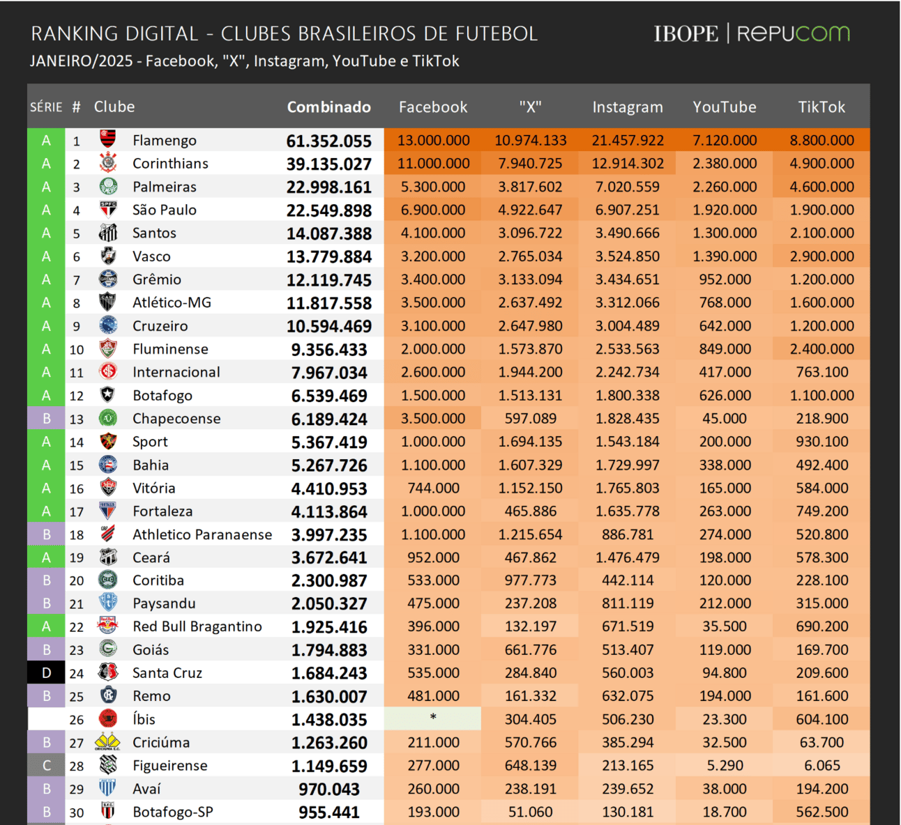 Um estudo do Ibope Repucom destacou o desempenho digital dos clubes brasileiros em 2024 a partir do crescimento de seguidores nas redes sociais. Durante o ano, o Flamengo, Corinthians e Palmeiras concentraram mais da metade das novas adesões, com o Instagram e o TikTok sendo responsáveis por 80% das novas inscrições no período.
