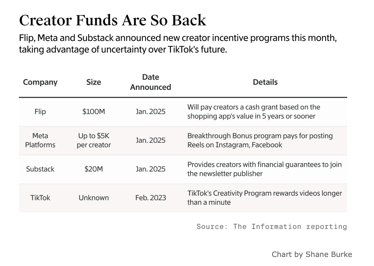 Com a incerteza sobre o futuro do TikTok, concorrentes estão retomando uma estratégia de 2021: fundos para criadores. Plataformas como Flip e Substack lançaram incentivos financeiros para atrair influenciadores, enquanto a Meta reativou bônus para Reels.