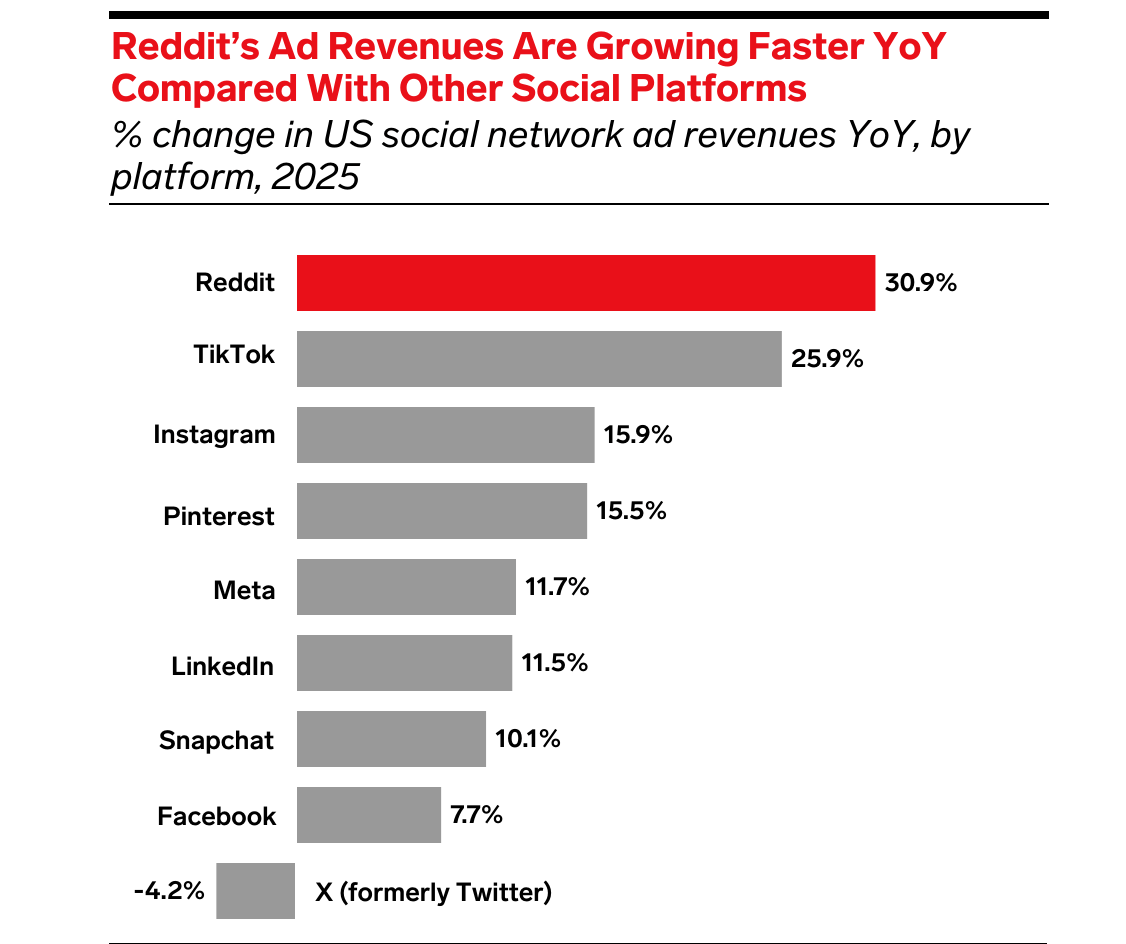 O impacto vai além do consumo de conteúdo: 6% dos pequenos empresários nos EUA já geram mais receita no Reddit do que no Google, e a receita de anúncios da plataforma deve crescer 30% este ano (vs. 25% no TikTok e 15% no Instagram).